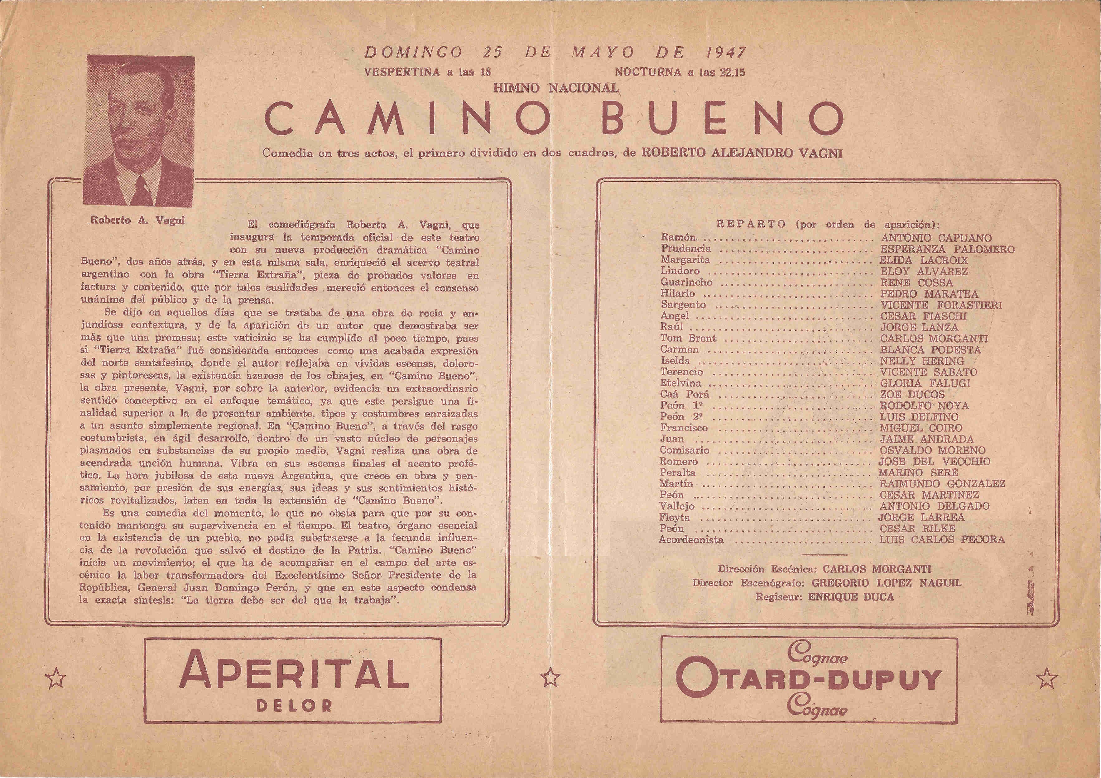 “El comediógrafo Roberto A. Vagni, que inaugura la temporada oficial de este teatro con su nueva producción dramática “Camino Bueno”, dos años atrás, y en esta misma sala, enriqueció el acervo teatral argentino con la obra “Tierra Extraña”, pieza de probados valores en factura y contenido, que por tales cualidades, mereció entonces el consenso unánime del público y de la prensa. Se dijo en aquellos días que se trataba de una obra de recia y enjundiosa contextura, y de la aparición de un autor que demostraba ser más que una promesa; este vaticinio se ha cumplido al poco tiempo, pues si “Tierra Extraña” fue considerada entonces como una acabada expresión del norte santafesino, donde el autor reflejaba en vívidas escenas, dolorosas y pintorescas, la existencia azarosa de los obrajes, en “Camino Bueno”, la obra presente, Vagni, por sobre la anterior, evidencia un extraordinario sentido conceptivo en el enfoque temático, ya que este persigue una finalidad superior a la de presentar ambiente, tipos y costumbres enraizadas a un asunto simplemente regional. En “Camino Bueno”, a través del rasgo costumbrista, en ágil desarrollo, dentro de un vasto núcleo de personajes plasmados en substancias de su propio medio, Vagni realiza una obra de acendrada unción humana. Vibra en sus escenas finales el acento profético. La hora jubilosa de esta nueva Argentina, que crece en obra y pensamiento, por presión de sus energías, sus ideas y sus sentimientos históricos revitalizados, laten en toda la extensión de “Camino Bueno”. Es una comedia del momento, lo que no obsta para que por su con-tenido mantenga su supervivencia en el tiempo. El teatro, órgano esencial en la existencia de un pueblo, no podía substraerse a la fecunda influencia de la revolución que salvó el destino de la Patria. “Camino Bueno” inicia un movimiento; el que ha de acompañar en el campo del arte escénico la labor transformadora del Excelentísimo Señor Presidente de la República, General Juan Domingo Perón, y que en este aspecto condensa la exacta síntesis: “La tierra debe ser del que la trabaja”.