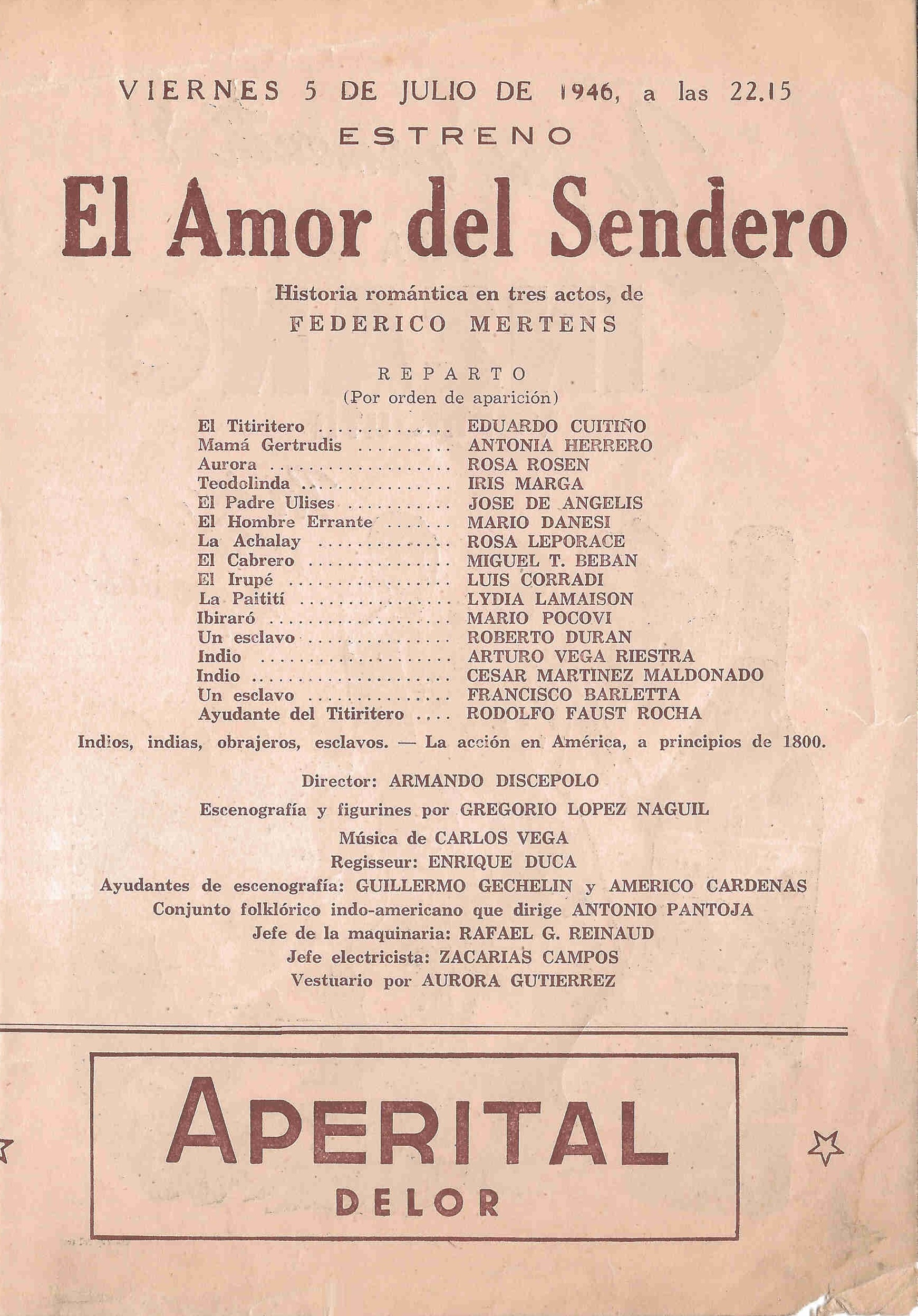 Del programa de mano: “El amor del sendero es la última producción de don Federico Mertens, autor de una copiosa labor teatral en sus treinta y cinco años de empeñosa y lucida dedicación a nuestra escena. Comediógrafo de éxitos sostenidos, como “Las d’enfrente” y “Mamá Clara”, o de obras de jerarquía intelectual como “La Zarza en llamas”, laureada por la Comisión Nacional de Cultura, en esta comedia parece apartarse de sus predilecciones de teatro costumbrista y humorístico para penetrar en el teatro poemático, de factura encaminada hacia manifestaciones de superación. Especialmente invitado por la Comisión Nacional de Cultura a escribir una obra para el Teatro Nacional de Comedia, Federico Mertens nos brinda “El amor del sendero”, pieza de aliento en la que, evidentemente, su autor busca un nuevo camino, una renovación de sí mismo, en su inquieto afán de no parecer el de ayer y de armonizar con las tendencias modernas de forma, las antiguas y esenciales de fondo, de teatralidad directa al público. De tal suerte, con un trabajo de indudable categoría artística, Federico Mertens ha respondido dignamente a dicha invitación, demostrando su propósito de contribuir al enaltecimiento de la escena vernácula y de ofrecer, a, la vez, a los intérpretes, las mejores posibilidades para cimentar sus aptitudes artísticas. “El amor del sendero” reúne el atractivo de una doble novedad, igualmente interesantes. La del estreno en sí, de una obra nueva subscripta por un autor de prestigio; y la de presentar un aspecto desconocido del mismo, que con ella destacará sin duda entre su producción, los méritos de una obra de plenitud lograda en la culminación de su carrera artística.”