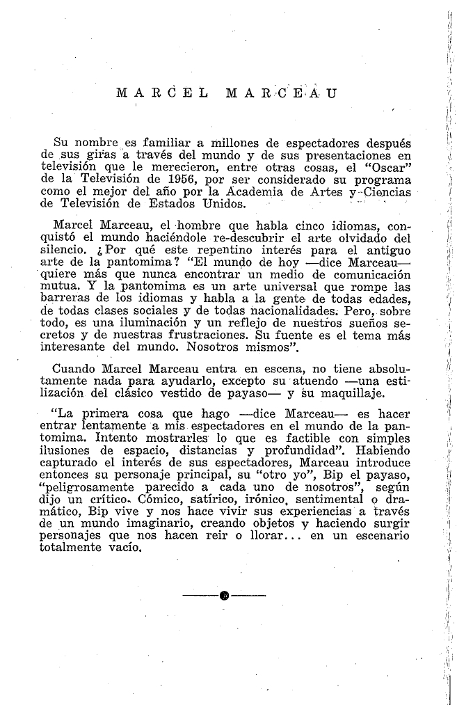 (1961) “En mayo se presenta además el celebrado mimo francés Marcel Marceau en gira sudamericana, con Pantomimas de estilo y Pantomimas de Bip“
