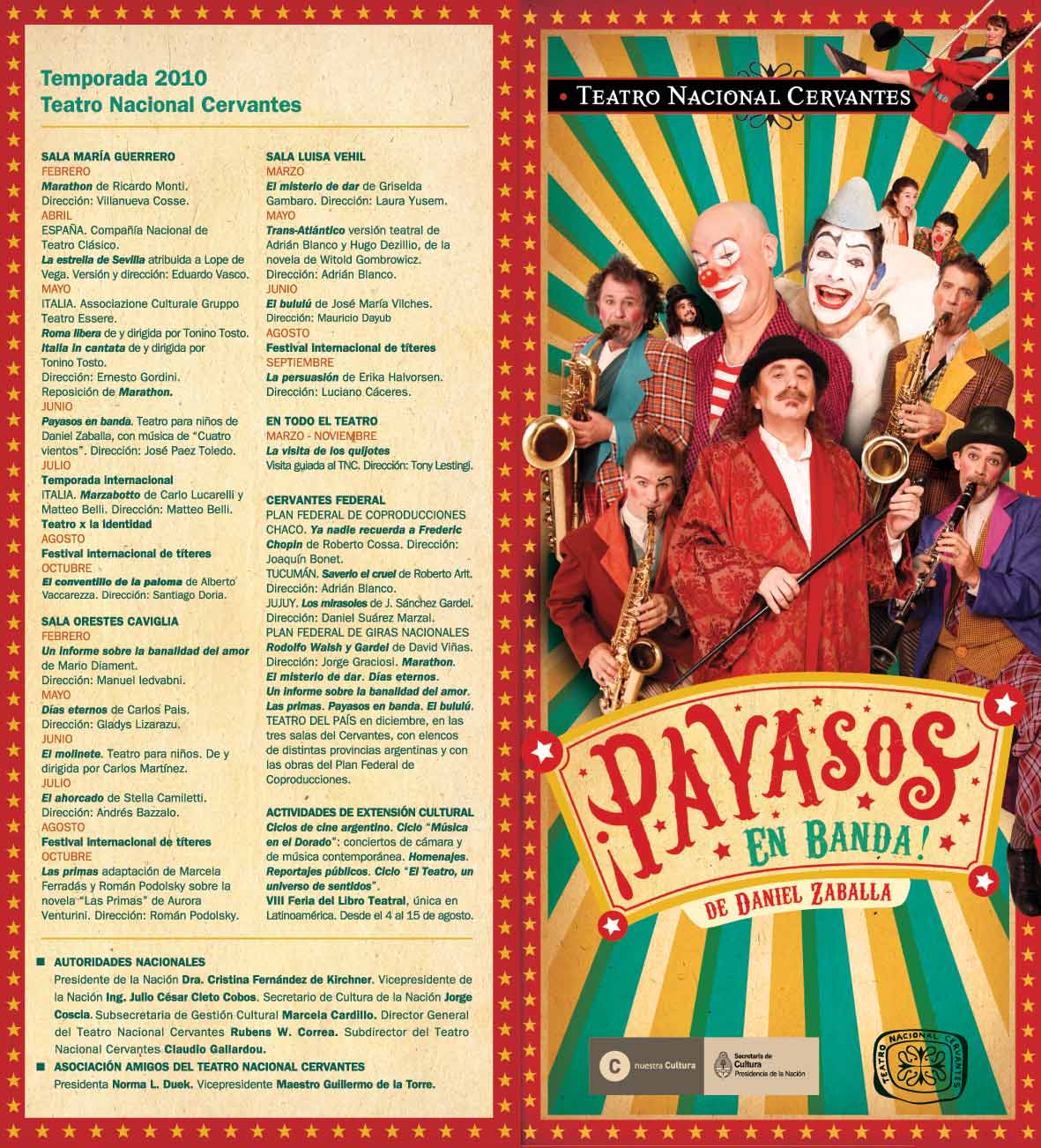 (2010) “El 12 de junio en la Sala María Guerrero se estrena el espectáculo para niños Payasos en banda de Daniel Zaballa, que obtuviera el 3er. premio del Concurso Nacional de Dramaturgia (Teatro Infantil 2010) del Instituto Nacional del Teatro. La dirección es de José Páez Toledo, dedicado al teatro para niños en España, donde reside; la escenografía de Jorge Crapanzano, escenógrafo y realizador de muñecos con numerosos premios; vestuario de Marta Albertinazzi, iluminación Jorge Pastorino, coreografía Juan Pablo Sierra, música de Jorge Polanuer, integrante de la banda de músicos Cuatro Vientos, que actúa en el espectáculo, con los actores Roberto Catarineu, Carolina Bujas, Gustavo Oliver, Daniel Zaballa y otros.”